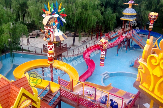 南宮溫泉度假村的水上項目獨具風格,以部落主題展現,栩栩如生的部落人物造型,夸張的巫師頭像,搭配亭....