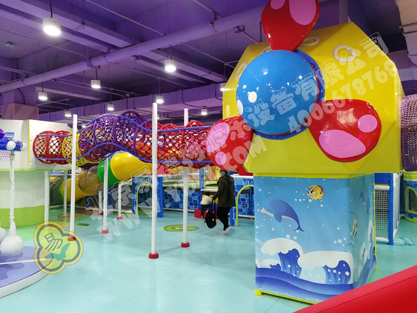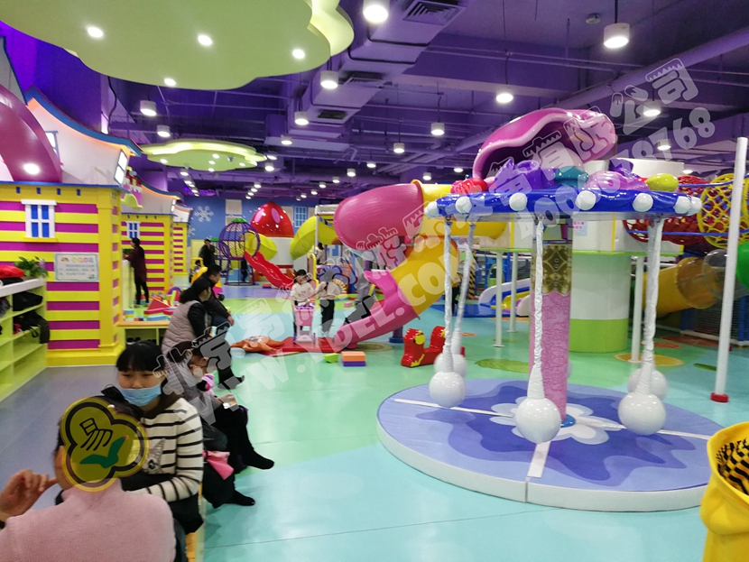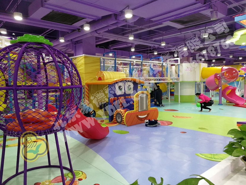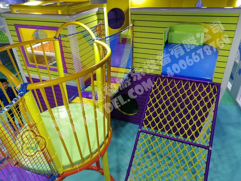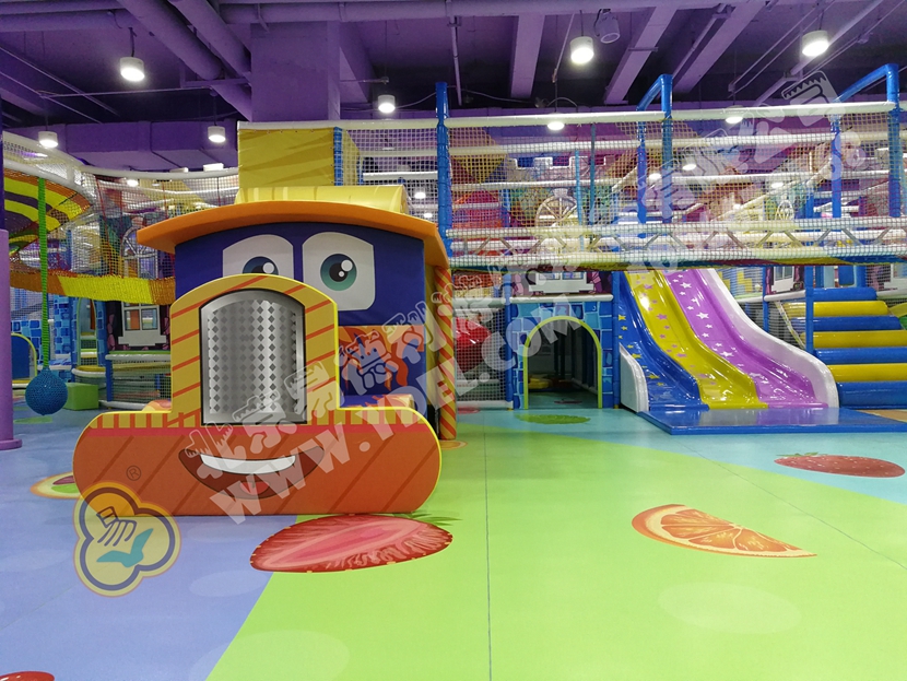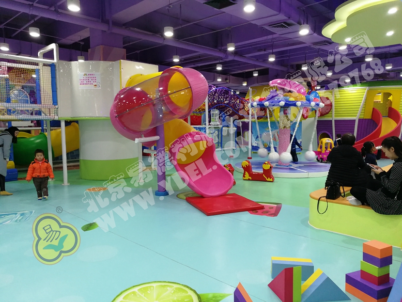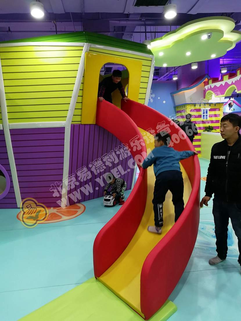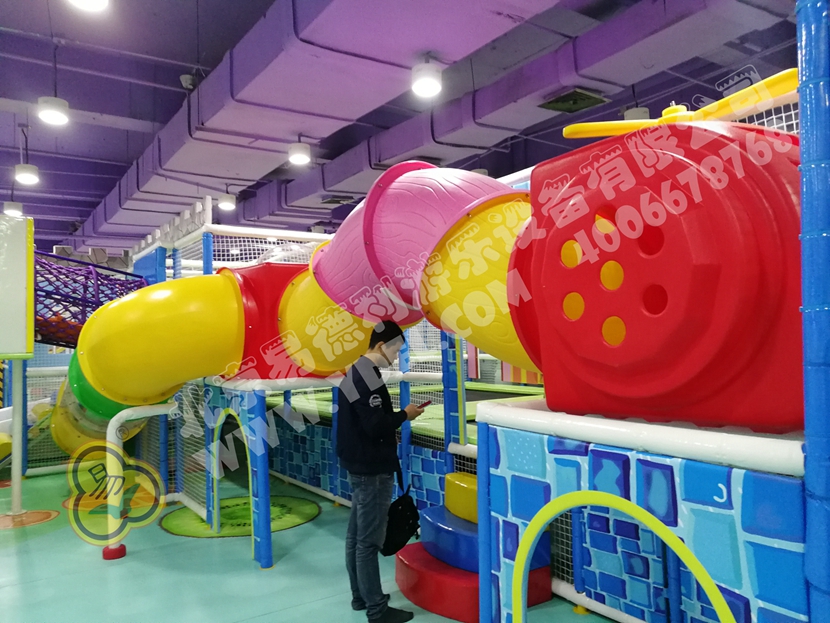 這是園內的明星區(qū)域“童童夢夢歷險記”超酷主題區(qū)。里面布置有積木類、淘氣堡、繩網類、運動蹦床、騎乘小車等各類游樂設備。而從現(xiàn)場觀察所得,這里也是人氣最鼎盛的一個區(qū)域,很多小孩子都在這個區(qū)域久久停留,不肯離去;家長們也紛紛入內,與孩子們親密互動,好一片溫馨的親子氛圍。