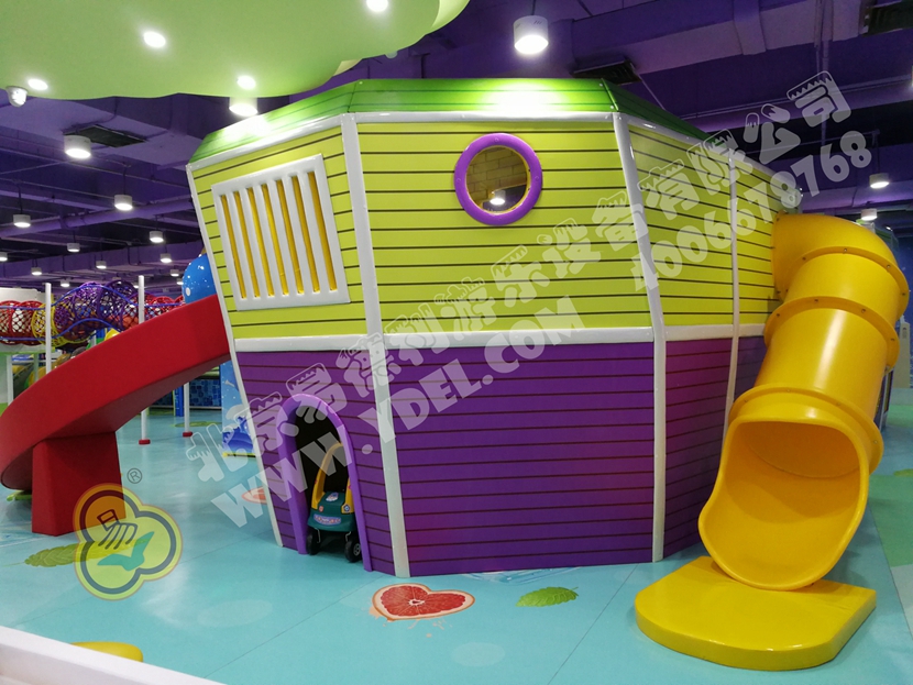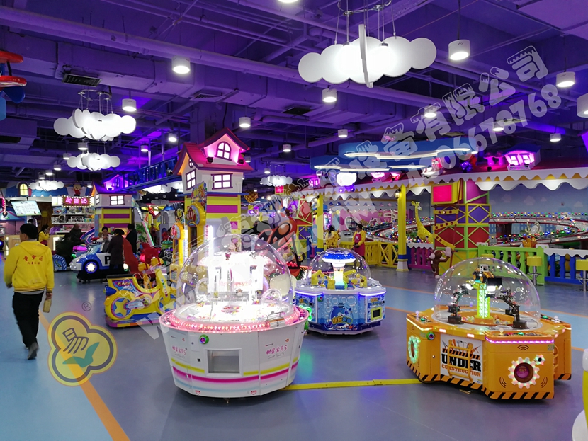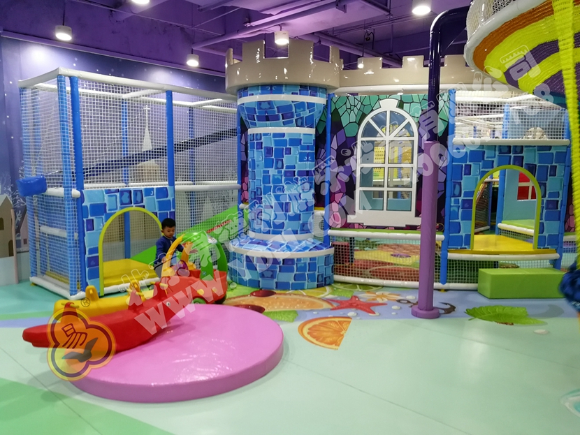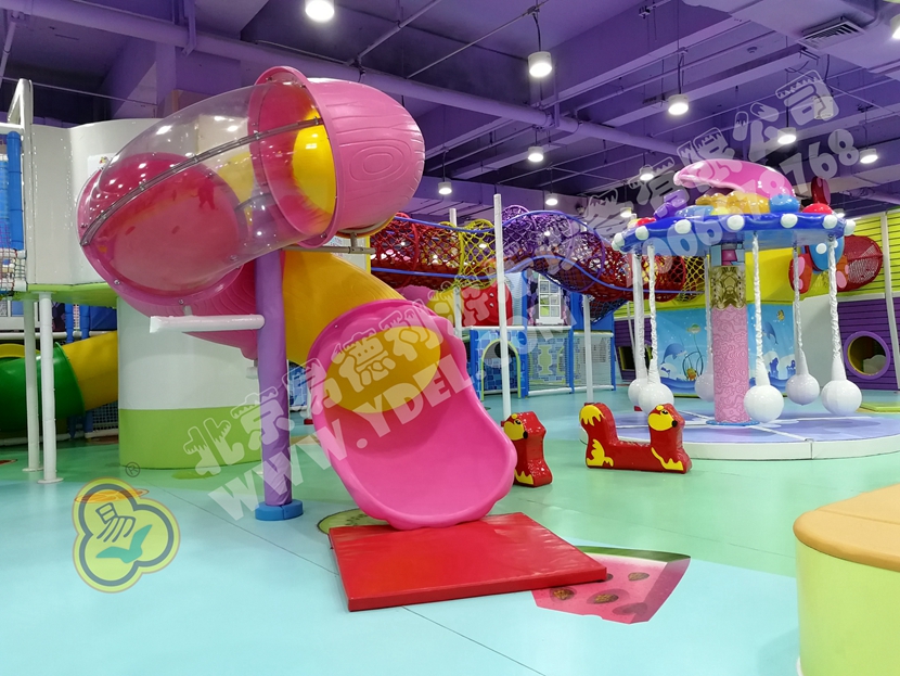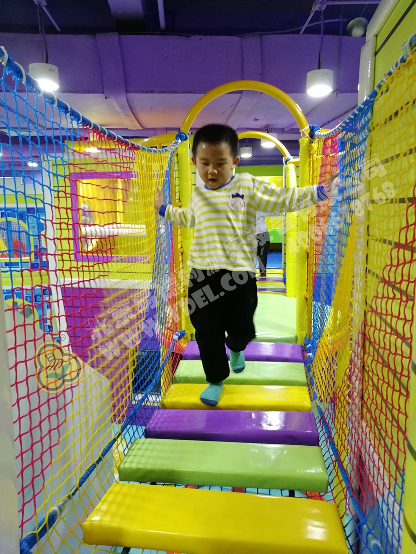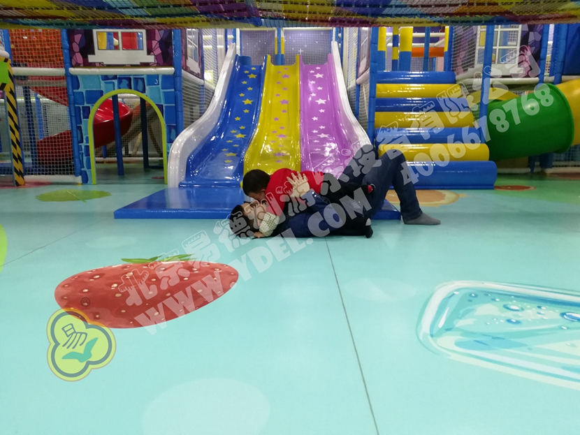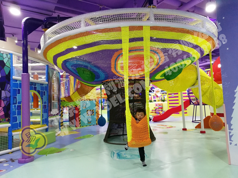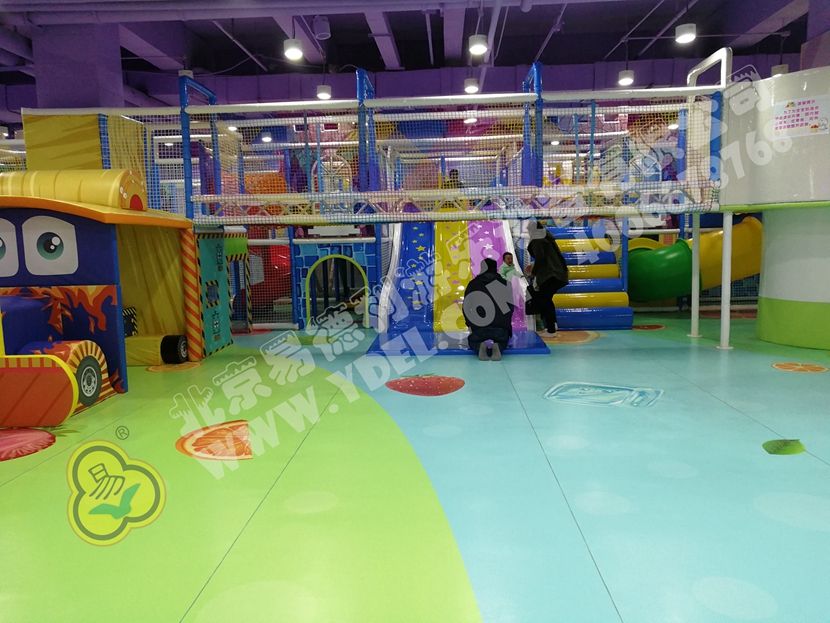 這是園內的明星區(qū)域“童童夢夢歷險記”超酷主題區(qū)。里面布置有積木類、淘氣堡、繩網類、運動蹦床、騎乘小車等各類游樂設備。而從現(xiàn)場觀察所得,這里也是人氣最鼎盛的一個區(qū)域,很多小孩子都在這個區(qū)域久久停留,不肯離去;家長們也紛紛入內,與孩子們親密互動,好一片溫馨的親子氛圍。