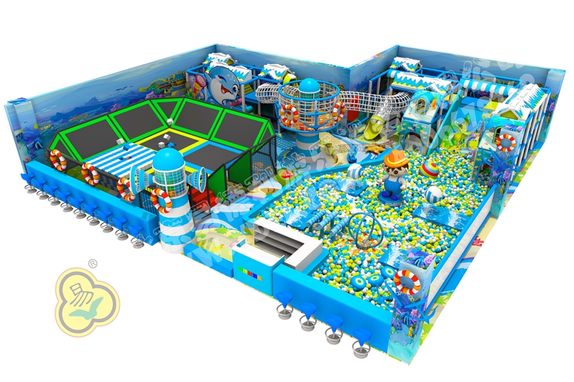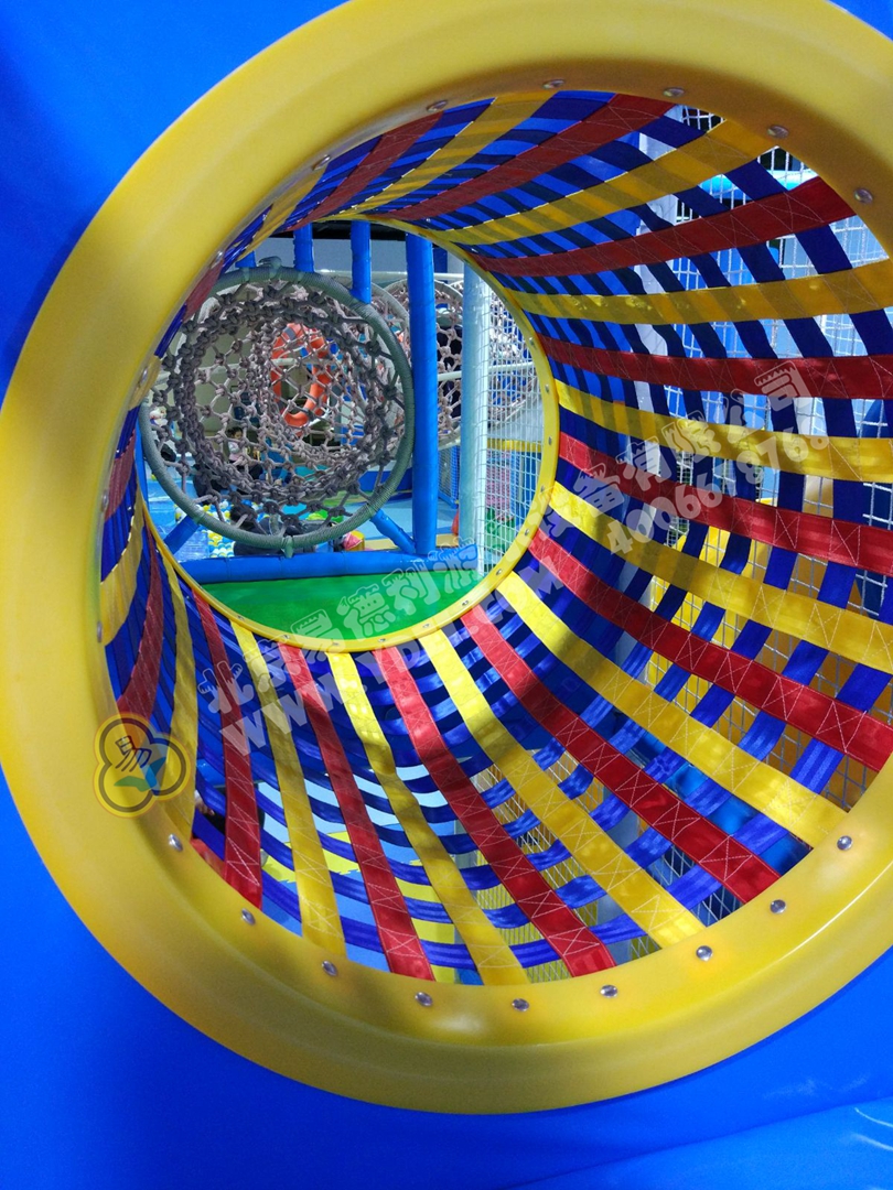 正面蹦,側面蹦,這就是超級蹦床的無限可能,一言不合就跳入中間的海綿塊池體中暢游。框架爬上燈塔瞭望臺,又順著網繩爬到球池上方,中心投影大滑梯,生動互動。