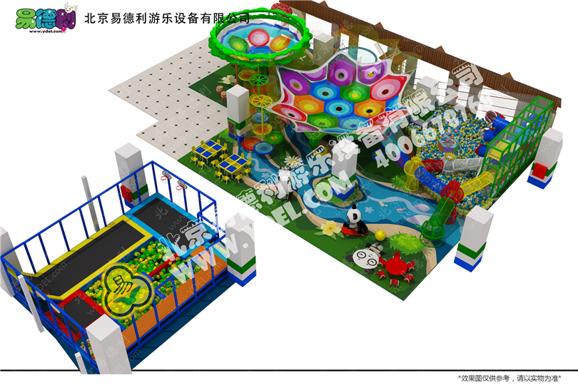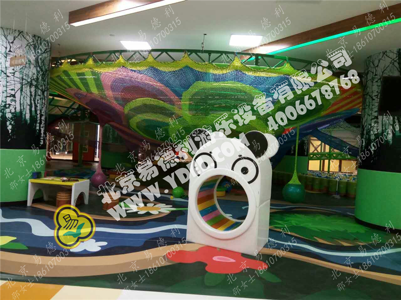 滿屋子的彩色繩網,這邊竄到那邊,那邊竄到另一邊,沉浸在歡樂的彩色繩網世界,這還沒完,連貫到皇冠網龍區一直到球池中央,孩子們樂享不停。深重綠色世界,各種熊貓角色,有種臥龍山區美感。