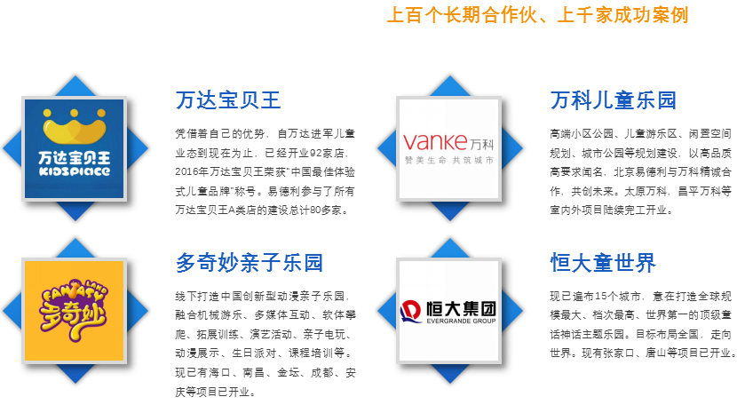 北京易德利游樂設備有限公司歷經二十多年的發展,現有管理、設計、技術等各類專業員工,業已成為華北地區淘氣堡游樂設備產業的知名企業,國內淘氣堡游樂設備企業佼佼者,是集設計、安裝、售后服務及物流配送為一體的綜合性